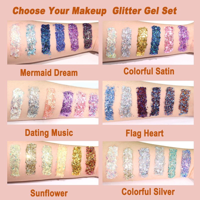 - Embrace Vibrant Hues With Our Glitter Gel: Our makeup glitter gel offers 6 stunning color sets, each includes 6 glitter shades. Whether it's for Mardi Gras, Independence Day, Halloween, St. Patrick's Day, Easter, Christmas, or Coachella, our iridescent glitter gel ensures a captivating allure. Enhanced with high-intensity pigments and holographic sparkle, our euphoria glitter lotion crafts a breathtaking effect that truly shines.
