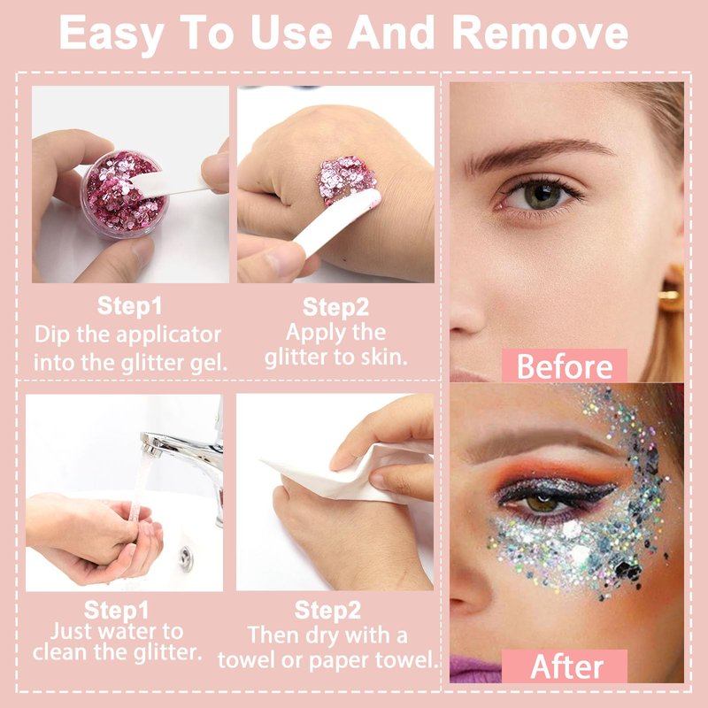 - Rave Makeup Glitter Gel: Our exquisite hair and body glitter gel set offers 6 sleek 10 ml bottles of rich and vibrant eye glitter gel, along with a glitter applicator, ensuring effortless and mess-free application of your makeup. The design of our glitter gel bottles is both stylish and practical, boasting a compact and space-saving form factor that is incredibly easy to carry, whether you're heading to a festive party or simply want to add a sparkle to your daily routine.