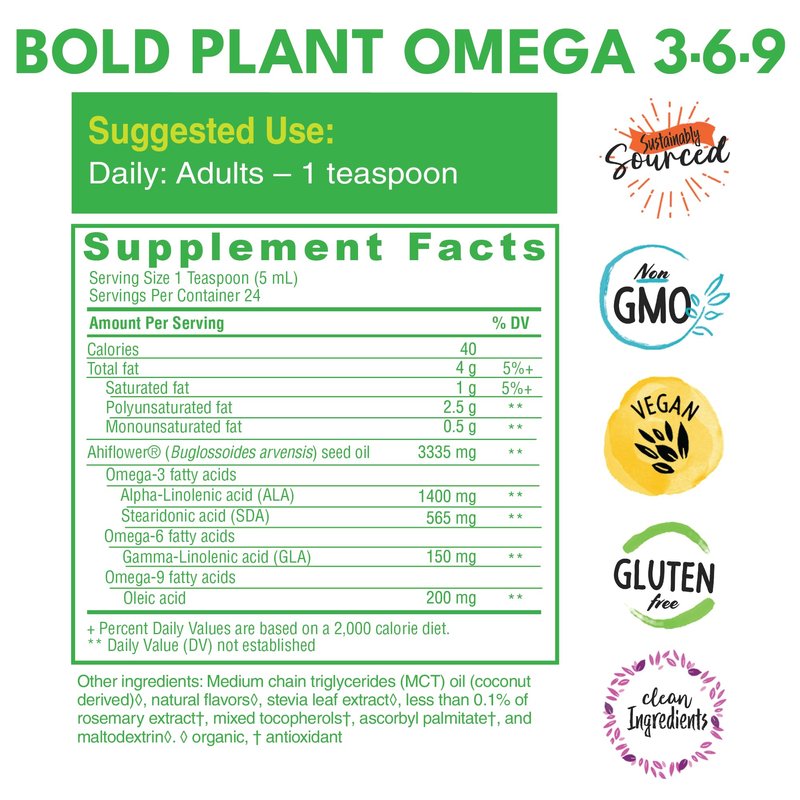 Bold Botanica Plant Omega 3-6-9, with Ahiflower Oil, Vegan Omega 3, Complete Plant-Based Omegas for Brain & Immune Health, Better Than Flax, Fish Free, Great Taste, Sugar-Free, Non-GMO, Liquid- 4 oz