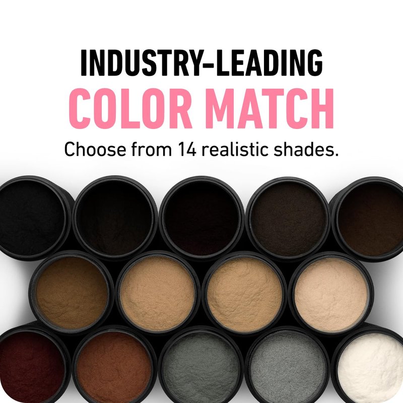 - Industry-leading worry-free Color Match Guarantee: Simply choose the hair thickener fibers shade you think will most closely match your natural hair color, buy it, and try it. If the color’s not quite right, simply let us know...our dedicated in-house Customer Care Team will use your feedback to help find your perfect match, and get it to you as quickly as possible at no additional cost!