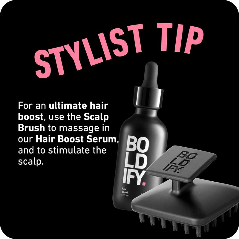 - PROFESSIONAL 100% SILICONE SCALP MASSAGE BRUSH: BOLDIFY Professional Scalp Massage Brush is made of 100% silicone to give yourself a satisfying massage while washing your hair. The waterproof scalp scrubber aids exfoliation, removing dead skin cells, and also does wonders for ridding the scalp of dandruff. Use to massage in BOLDIFY Hair Boost Serum for an easy way to enhance your hair care routine!