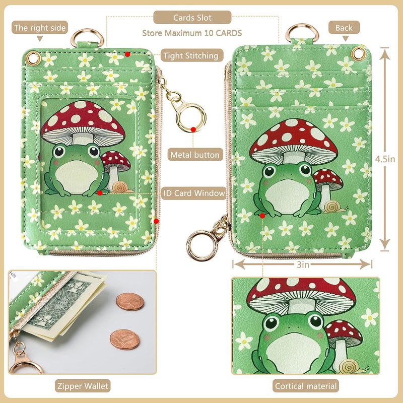 bolimoss 2-in-1 ID Badge Holder & Lanyard Wallet, Frog Mushroom Lanyard for ID Badge Wallet,Lanyard Wallet with Zipper Pocket,Cute Florals Badge Holder with Detachable Neck Wrist Lanyard