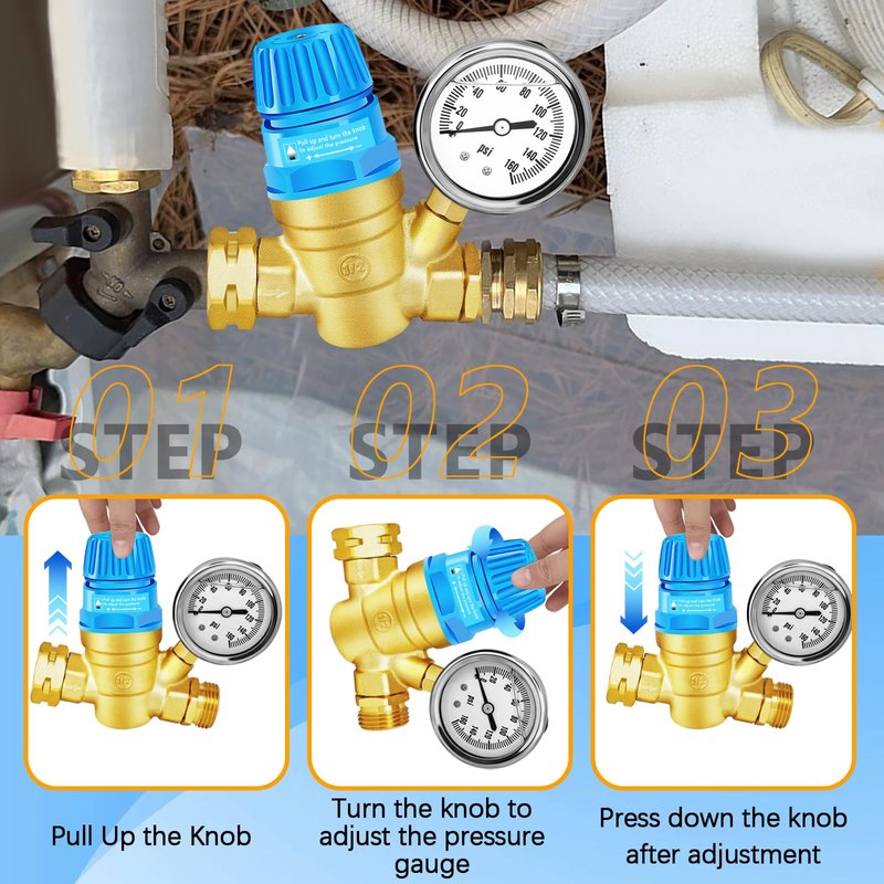 Water Pressure Regulator, 3/4’’ GHT Handle Adjustable Brass Lead-Free RV Pressure Reducing Valve with Oil Filled Gauge 160PSI for RV Camper Travel Trailer Garden Feature: 1. Regulate the water's pressure coming into your camper, protect RV/trailer from high water pressure. 2. Gauge displays up to 160 PSI, factory setting is about 45 PSI. Dial pointer will rotate when turning the knob. 3. Oil inside the gauge minimizes friction between internal components for longer life, regulator inlet screen mesh helps to filter particles to prevent impurity blocking. 4. Temperature changes or shaking of shipping may cause bubbles in the pressure gauge, which is normal. if you have any questions, we are here for you at any time. 5. The packaging includes a water pressure regulator, two inlet screen filters, one sealing tape. Specification: Material: lead-free brass Applicable medium: water Nominal diameter: DN20 Thread: 3/4" NH thread Pressure environment: atmospheric pressure Operating temperature: 14F ~ 200F Direction of flow: Unidirectional Maximum Pressure: 160 psi Installation Guide: 1. Connect the female fitting on the adjustable water regulator directly to your water source's hose bib. 2. Connect the male fitting on the water hose to the male fitting on the adjustable water regulator. 3. Turn on the water supply in order to flush the water regulator and hose for one minute. Turn off the water supply. 4. Connect the hose to your RV's water inlet, then turn on the water supply. 5. Turn on all RV fixtures to allow any air to be flushed out of the RV plumbing - this includes turning on showers, faucets, and flushing toilets. 6. Adjust the regulator at top by hand until it is set to the desired pressure reading. Ensure that all RV fixtures have been turned off while making adjustments until you reach the desired pressure reading.