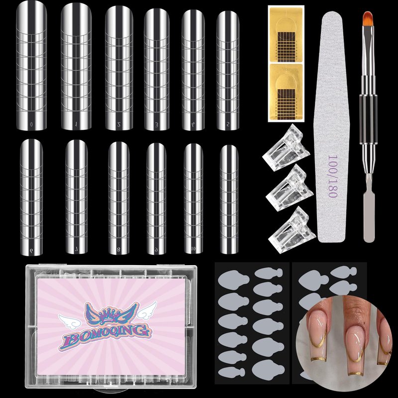 - 💓All-In-One Poly Nail Gel Kit: BOMOQING gel nail art kit contain: ①120 pieces of dual nail forms ②100 pieces of nail forms papery③ 24 pieces of duet system forms silicone,④3 nail clips, ⑤a dual-ended builder brush,⑥a nail file buffer,one set can satisfy all your needs for poly nail gel tools.
