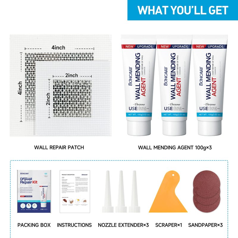 - 【Drywall Repair Patch Kit】The drywall repair kit includes 3x Wall mending agent (100g), 3x Nozzle Extender, 1x Scrapers, and 3x Sandpaper, 1xWall Repair Patch 2inch,1xWall Repair Patch 4inch.