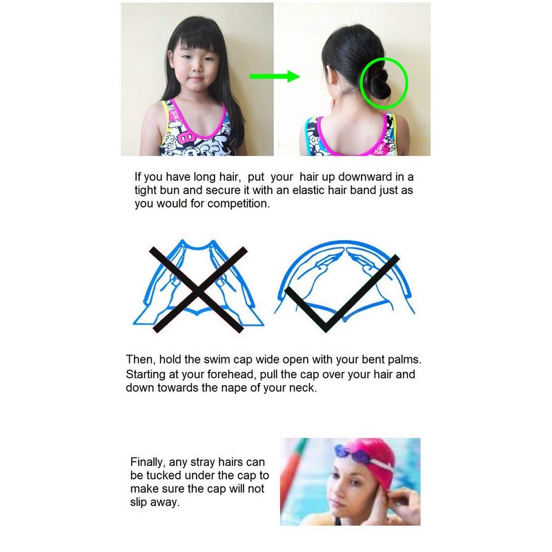 The cap is made of excellent silicone on the market. It is a kind of elastic product with soft handle and strong extensibility. In this way, it not only ensures good tightness, but also ensures comfort. The stamping parts are resistant to chlorine, ultraviolet and sea water. It can be used for daily training or competition, and it is completely satisfied. Outstanding features: -Silicon 100% -Perfect for indoor and outdoor swimming pools -Flexible security and adaptive adjustment Airfoil optimization -Easy to install and remove Recommended use: Perfect for swimming practice. Suitable for daily training or competition. The special density of silicone makes it a very strong and flexible cap. Some Tips for Swim Caps: If you have long hair, put your hair up downward in a tight bun and secure it with an elastic hair band just as you would for competition. Then, hold the swim cap wide open with your bent palms. Starting at your forehead, pull the cap over your hair and down towards the nape of your neck. Finally, any stray hairs can be tucked under the cap to make sure the cap will not slip away. Try using baby power, talcum power, or corn starch in the cap while in storage, making it easier to put on without snagging.