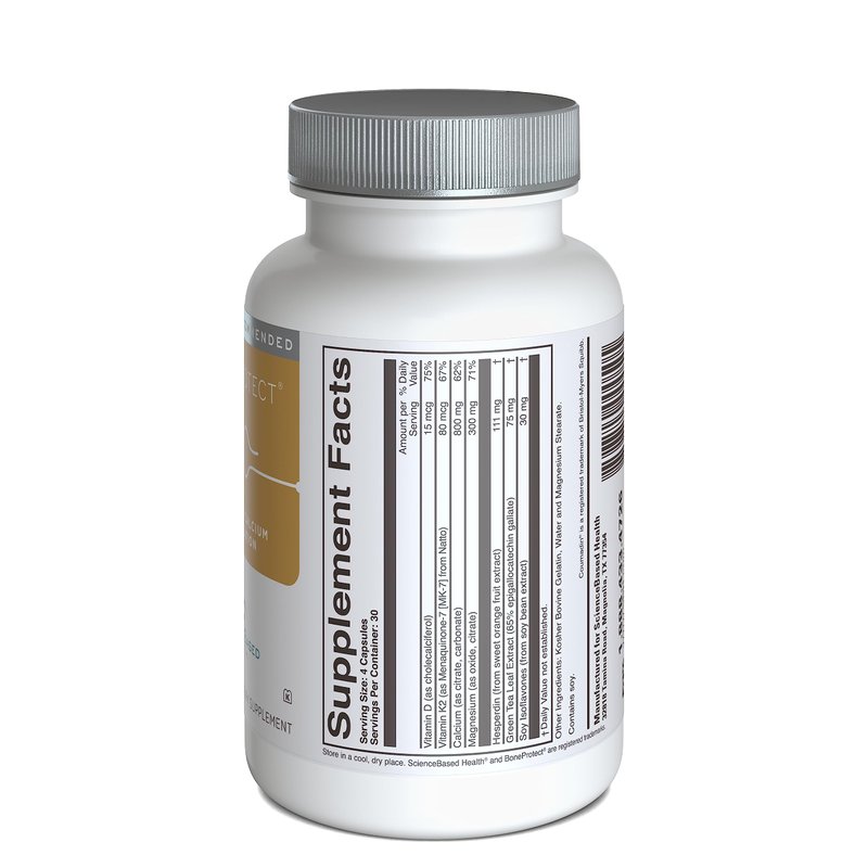 BoneProtect is a balanced formulation designed for both women and men to help achieve peak bone mass and retain bone density, help maintain blood pressure within normal limits, and to promote colon health. This formula provides 800 mg of highly concentrated and absorbable calcium sources in four easy-to-swallow capsules daily. BoneProtect also provides vitamin D to stimulate calcium absorption, magnesium to help form bone and cartilage, and vitamin K2 to help bind minerals to bone matrix. The formula also contributes a unique blend of plant nutrients, combining isoflavones – the bone-healthy components of soybeans, with the antioxidant flavonoids hesperidin and green tea catechins that may help protect bone cells.