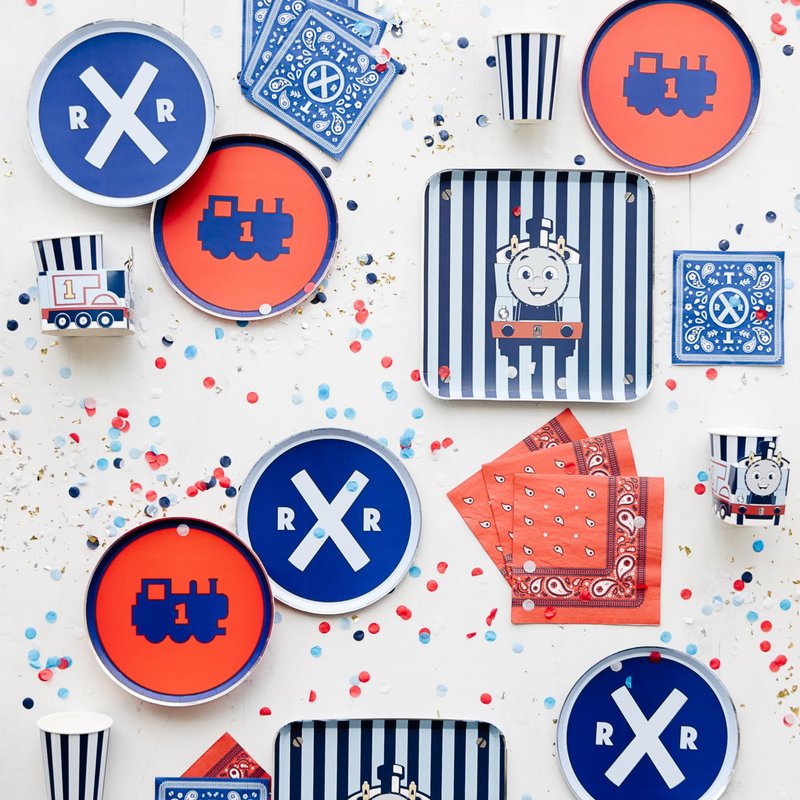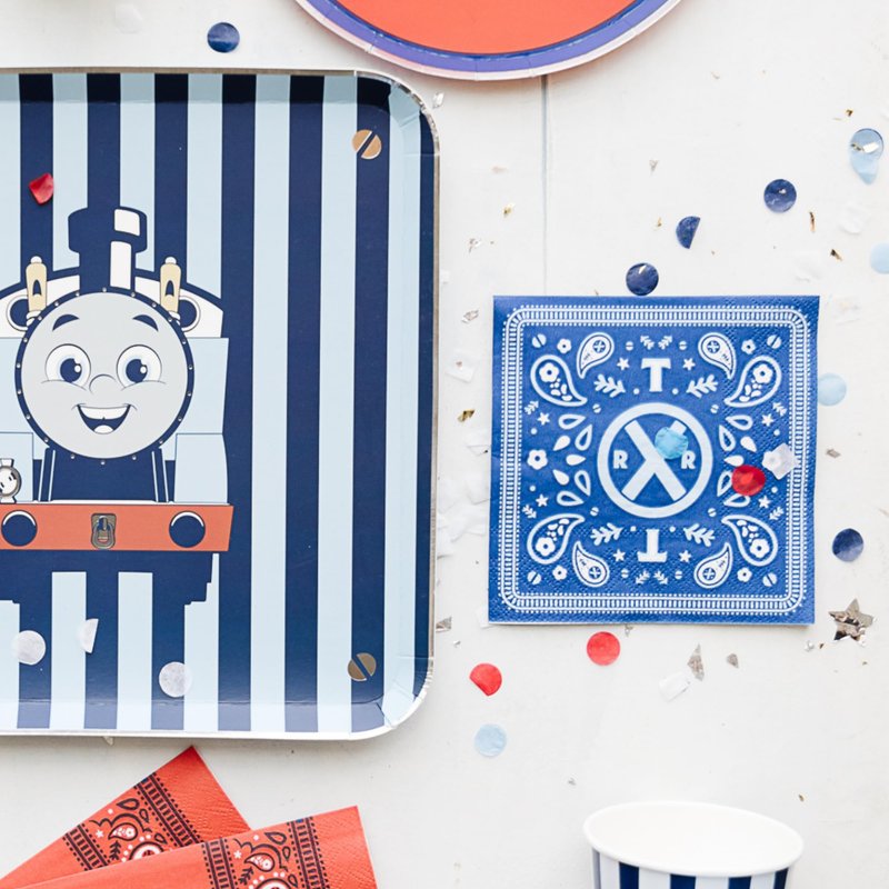 - EYE-CATCHING BANDANA DESIGN: Make your party decor pop with these vibrant napkins! Each pack includes 24 beautifully crafted napkins featuring a charming blue bandana print adorned with playful railroad signs and track patterns. This bold and lively design adds an exciting touch of train-themed fun, perfectly complementing your Thomas & Friends celebration.