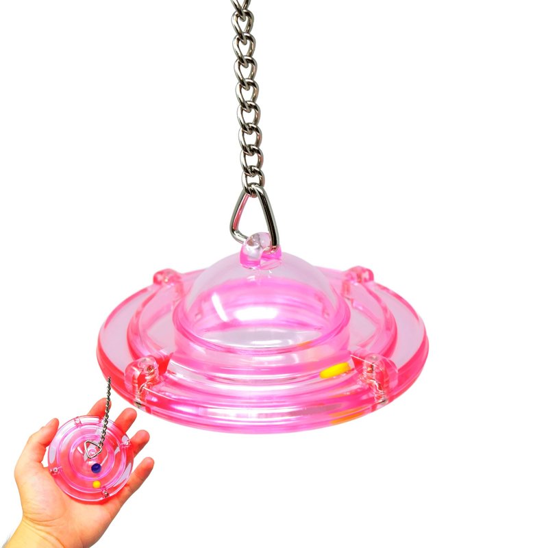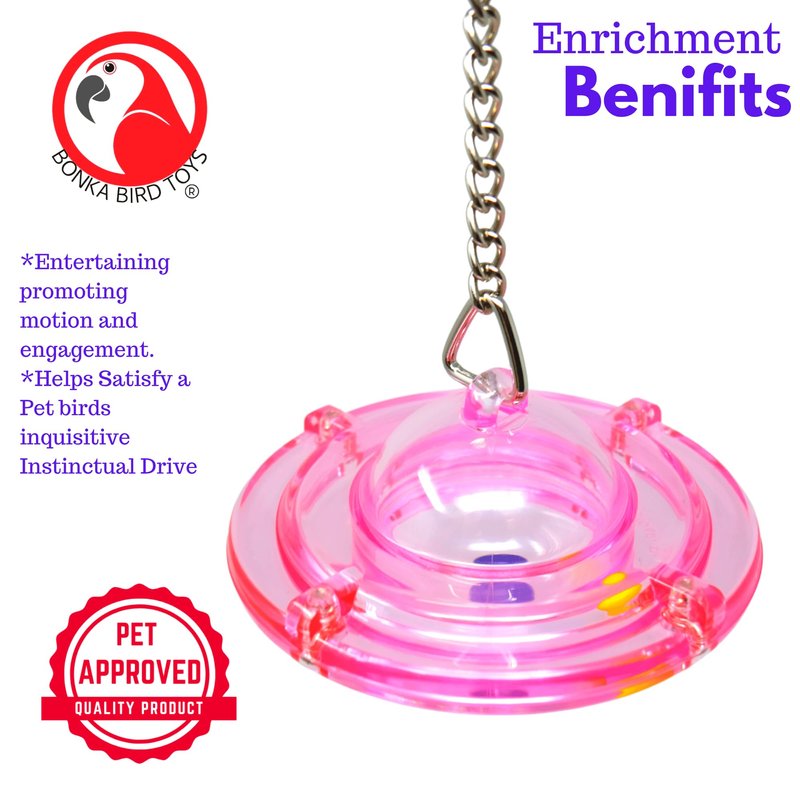 Bonka Bird Toys 0012 Small Saturn is a colorful, playful toy; the brightly colored main body is made up of four sections, each containing a solid colored bead, which makes a whirring sound when rattled. It is constructed of bulletproof plastic and will last much longer than your regular-style chew toys. Your small to medium-sized bird will be entertained with all the motion that this toy offers. It is suspended with a sturdy Stainless Steel link chain with a quick link attachment; it measures approximately 9 inches high by 3 inches wide.