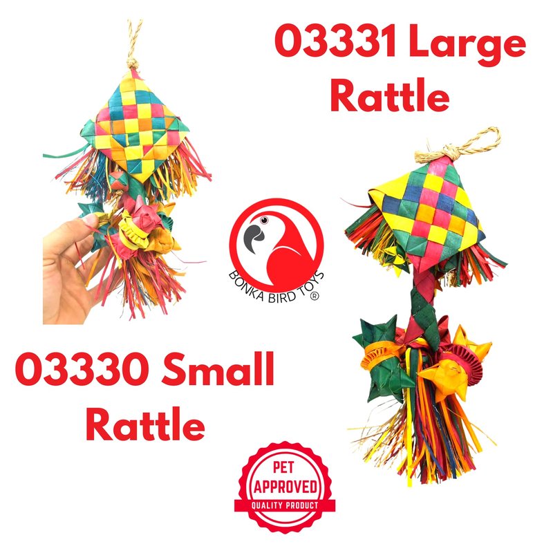 Introduce your feathered friend to a world of fun with the 03330 Small Rattle, the ultimate toy designed for small to medium-sized birds. This vibrant and colorful toy is expertly crafted to cater to your bird's natural instincts for chewing and shredding, providing them with endless hours of entertainment. The rattle, made from genuine palm leaf and filled with natural seed pods, offers a treasure trove of surprises that will keep your pet engaged and entertained. The toy's multi-activity design ensures there's always something new for your bird to explore, from shaking the rattle to tearing it apart. It's not just about fun; it's about stimulating your bird's senses and encouraging healthy playtime habits. Measuring approximately 12 inches in height and 5 inches in width, and equipped with a natural tied rope hanger, it's easy to install in your bird's cage and perfect for ensuring your bird remains active and happy. Crafted with all-natural, bird-safe materials, the 03330 Small Rattle is the perfect addition to any bird lover's collection, providing peace of mind about your pet's safety while they play. Elevate your bird's playtime experience with this toy, a pathway to endless fun and excitement.
