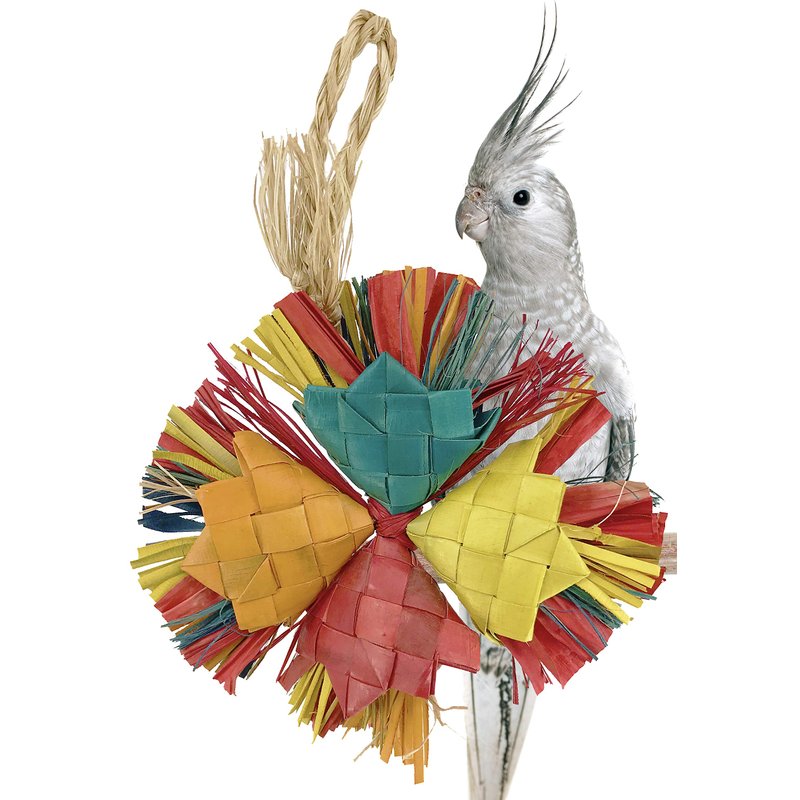 Four colorful woven petals are encircled with a brightly colored palm leaf spray, a dual shreddable and preening toy that will surely become a favorite.