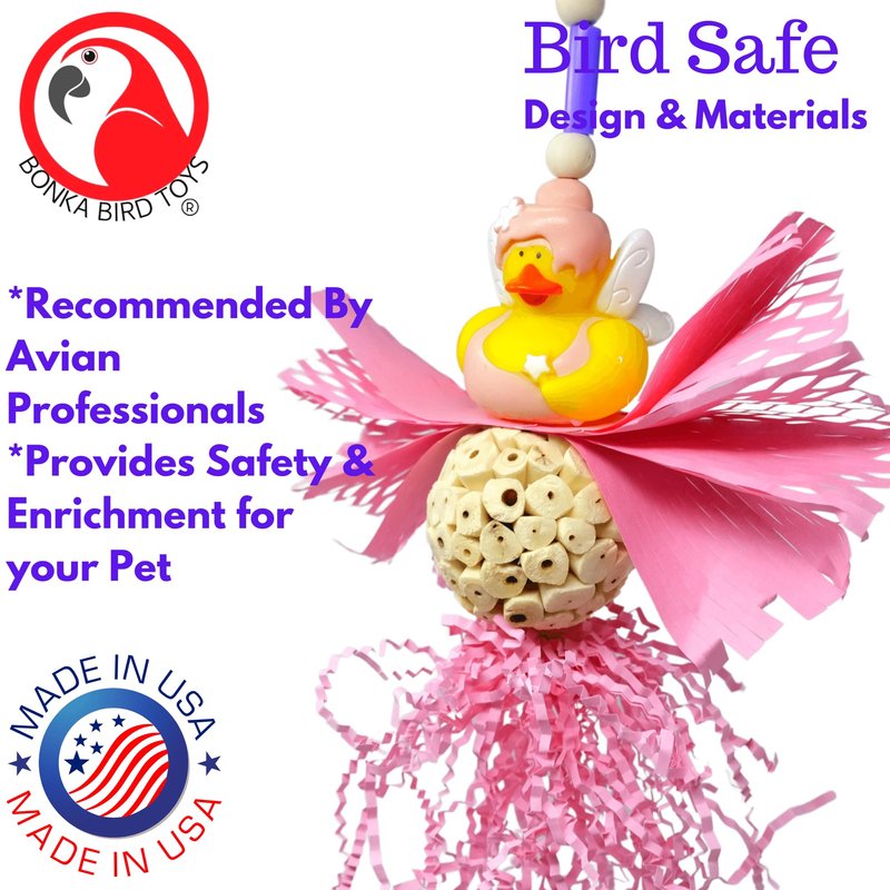 Bonka Bird Toys 1014 Sola Fairy - 8" H x 4" W, Rubber Duck and Sola Ball Toy with Pink Paper Tendrils, Parrot, Conure, Cockatiel, and Similar Size Breeds.