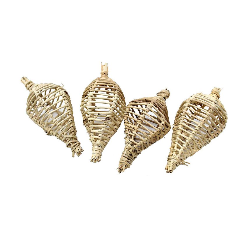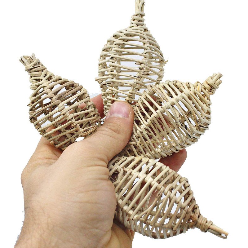 Four Natural woven vine lanterns, use them to throw around the cage, hide treats in them or make your very own toy, can be used in multiple ways. Measures approximately 5 inches long by 2 1/2 inches wide.