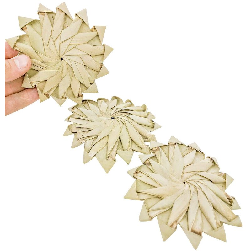 1271 All-natural woven palm leaf flowers (pack of 3), a great item to throw around the cage, all-natural and chewable, your feathered friend will be beak happy when this shows up. Measures approximately 3 inches in diameter. A great crafting/bird toy making item.
