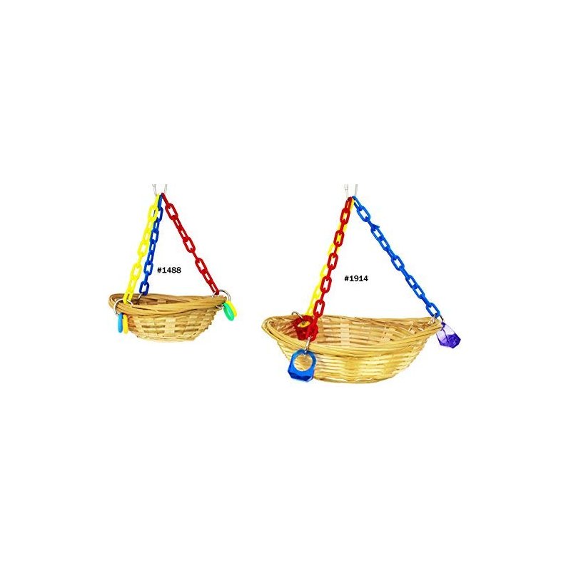 1488 Small basket is a fun home in the sky for your small-sized feathered friend. A natural woven basket is suspended with colorful solid link plastic chain and decorated with moveable plastic charms. The possibilities are endless with what you can put in the basket to make playtime fun, it measures approximately 6 inches high by 5 inches wide and comes complete with a quick link for easy cage placement.