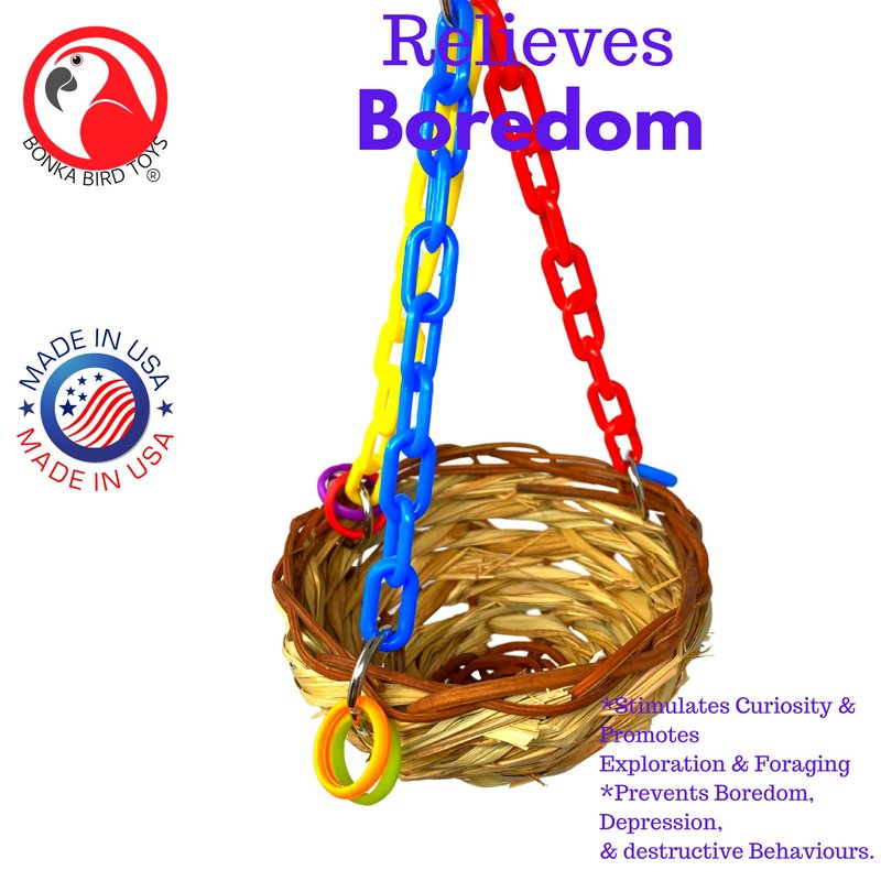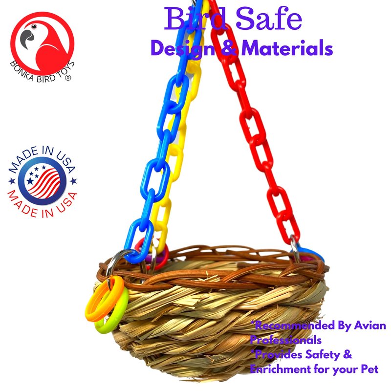 Welcome to the world of comfort and fun with the Bonka Bird Toys 1622 Nest Swing, a unique and charming abode crafted for your small-sized feathered friends like Parrotlets, Lories, Conures, and more. This swing is more than just a perch; it's a cozy haven for your bird to relax and play. The 1622 Nest Swing features a handwoven seagrass nest delicately suspended by colorful and durable plastic link chains. The basket's inviting design allows creative filling, such as soft nesting materials or treats, to create an engaging and interactive environment tailored to your bird's preferences. Measuring approximately 7 inches in height and 4 inches in width, this swing provides a snug and comfortable retreat for your avian companion. Installation is a breeze with the included quick-link attachment, making adding this beautiful swing to your bird's cage simple. The versatility of the 1622 Nest Swing lies in its dual function as both a dynamic perch and a delightful spot for your bird to lounge and play. Safety and fun go hand-in-hand with this swing. Crafted from non-toxic and bird-friendly materials, it ensures a safe and enjoyable experience for your pet. Bring a touch of whimsy and comfort to your bird's habitat with the Bonka Bird Toys 1622 Nest Swing. It's the perfect addition to their home in the sky, enhancing their daily routine with a blend of charm and entertainment.