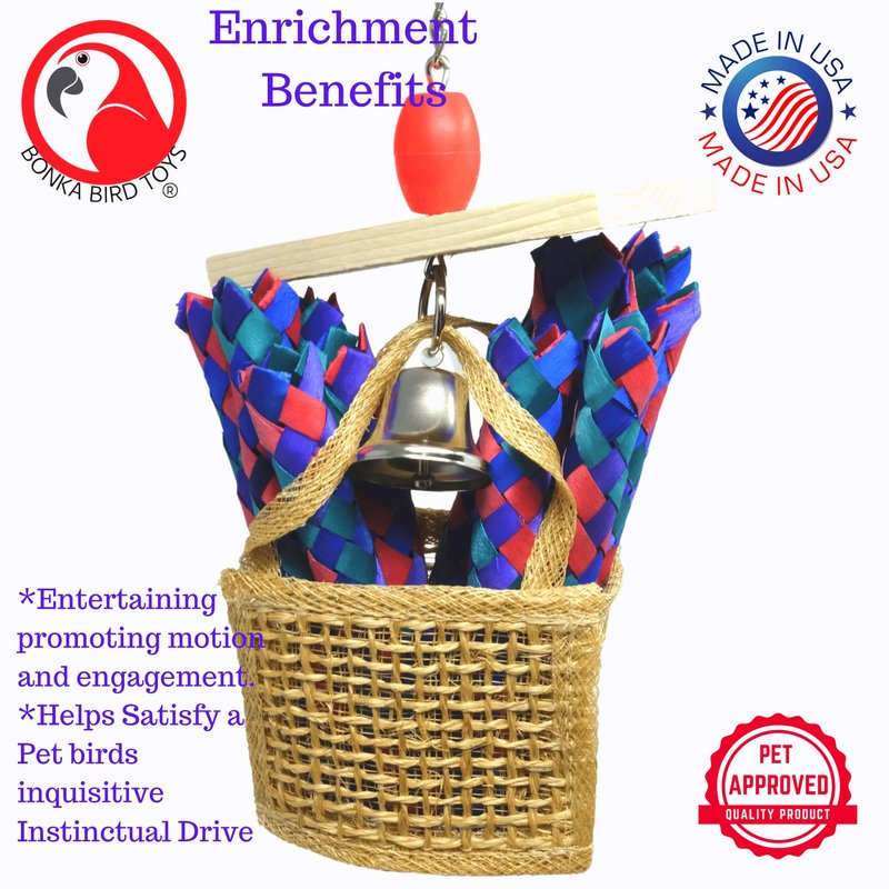The 1653 Chewy Bag is a perfect gift for your feathered friend. 1653 has lots of different activities for your pet bird to play with packed into a smaller size. 1653 has a quick link cage attachment for easy cage placement in almost any cage. From here there is a small sturdy chain which has a small metal ring that the toy hangs from. On this sturdy chain, there is a small plastic ball and a natural wooden parallelogram. Attached the metal ring at the bottom of the chain is a small metal bell. The metal ring loops through the small woven handles connected to the bag itself. The bag is made of soft woven natural fibers. Stuffed into the bag on either side are fun colorful finger traps that can be easily pulled out. 1653 does give your pet a great way to entertain its foraging instincts. Also, when the finger traps are pulled out the toy can be refilled with more finger traps or whatever material you like. The toy weighs about 2 ounces and measures approximately 4 inches wide by 8 inches high with a varying depth of 1.5 inches. Will come in assorted colors as to what is shown.