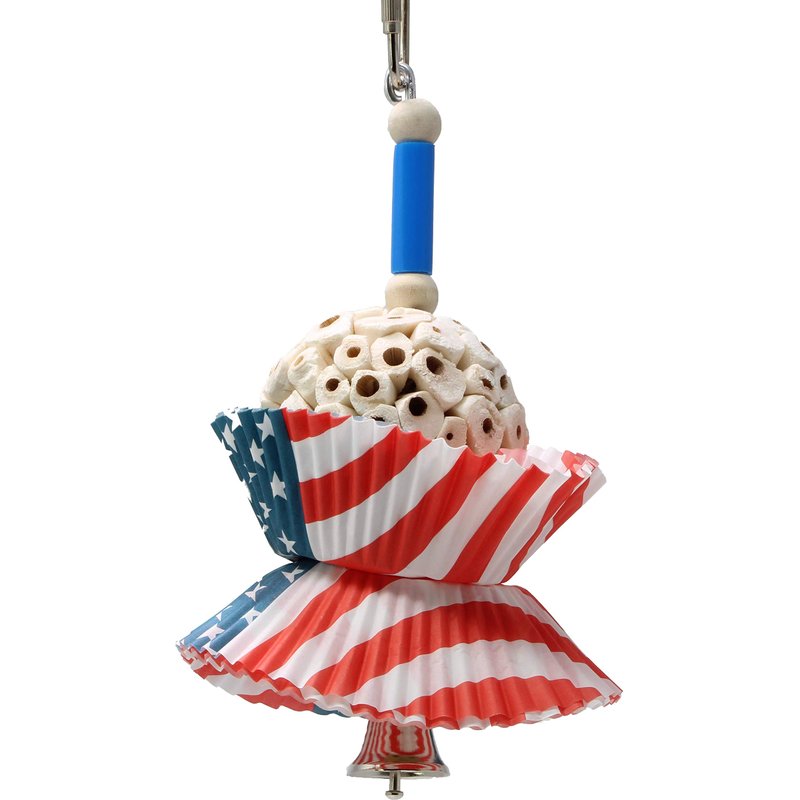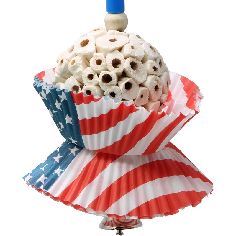 The 1925 USA Cake from Bonka Bird Toys is a classic shreddable bird toy that's perfect for small and medium-sized pet birds! This great lightweight shreddable delight has an appealing design and looks lovely in any birdcage. The top of this bird toy has a quick link connector to let you get it up in your pet's cage quickly and easily. A metal wire wraps around the quick link connector and continues through the center of the toy. At the top (2) natural wooden beads and a colorful piece of plastic straw adorn the metal wire. Next, your pet will find a big ball made of the root of the Sola plant. This is an all natural material thats perfectly safe for pet birds to chew, bite and forage. The sola ball sits inside of a couple of cup cake cups that are very soft and super easy for pets to shred and grab. There are more cup cake cups that are upside down with a piece of shreddy cardboard and a metal bell hanging from the bottom. The 1925 USA Cake is a great convenient size and is easily able to be placed in most bird cages. Height: (7) inches Width: (4.5) inches or (4 1/2) inches Weight: Under (2) ounces.