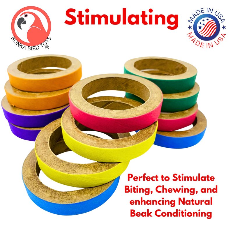 Bonka Bird Toys introduces the 2113 Pk12 Chew Bagel, a vibrant and engaging addition to your bird's playtime collection. This pack of twelve 2.75-inch chewable bagels is designed to keep your feathered friends entertained for hours. Crafted from layers of durable compressed cardboard, these bagels are not only safe for your birds to peck and play with, but they also encourage natural foraging and chewing behaviors. Each bagel is brightly colored to attract your bird's attention and add a pop of color to their environment. The engaging texture and simple ring shape make these toys versatile; they can be hung in the cage, used as decoration, or incorporated into other toys for increased stimulation. The possibilities for creative play are endless, allowing you to cut them up for extra material or use them in innovative ways to enrich your bird's living space.