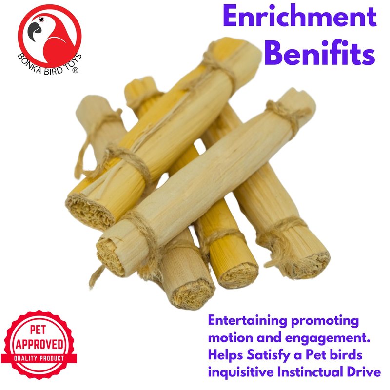 Bonka Bird Toys presents the 2375 PK5 4-inch Banana Leaf Sticks, designed to inspire natural play and foraging behaviors in your bird. These sticks are crafted from harmless, all-natural banana leaves, making them a safe and fun addition to your bird's toy collection. Perfect for DIY projects or as standalone play items, each stick measures 4 inches in length and 0.8 inches in diameter, weighing approximately 2 ounces per pack. The natural materials ensure your bird can chew and play safely, promoting mental and physical well-being. These sticks are versatile and can be used to create custom toys or to enhance existing ones, providing endless creative possibilities. Ideal for parakeets, cockatiels, lovebirds, conures, and any small to medium-sized bird, the 2375 PK5 4-inch Banana Leaf Sticks are a must-have for enriching your pet's environment and reducing boredom.