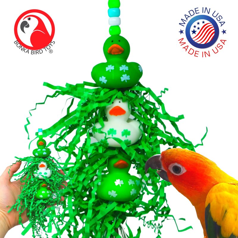 Embark on a delightful adventure with the 2422 Lucky Ducky from Bonka Bird Toys, a beautifully designed toy that promises endless entertainment for your feathered friends. Specifically crafted for small to medium-sized birds, this toy encourages essential behaviors such as chewing and preening, promoting both physical and mental health. The Lucky Ducky features an engaging array of elements, including five vibrant plastic beads that cascade down to three adorable rubber ducks, each decorated with four-leaf clovers, and interspersed with enticing green shreddy paper. This mixture of colors and textures is not only visually appealing but also invites your bird to explore and engage in a variety of activities designed for climbing, plucking, and preening. Setting up the Lucky Ducky is fast and effortless, thanks to the equipped quick-link connector, ensuring that fun is always just a moment away. Ideal for birds like Ringnecks, Medium Conures, Quakers, Caiques, and pets of a similar size, it is made in the USA with 100% bird-safe materials, offering you peace of mind and your bird a secure and stimulating playtime. With its bright, attractive colors, safe, engaging design, and convenient measurements of 9 inches in height and 2 inches in width, the 2422 Lucky Ducky is more than just a toy; it's a comprehensive playground that enriches your bird's life with joy, activity, and growth.