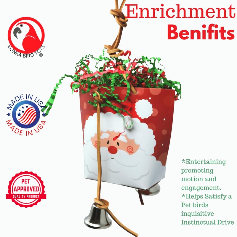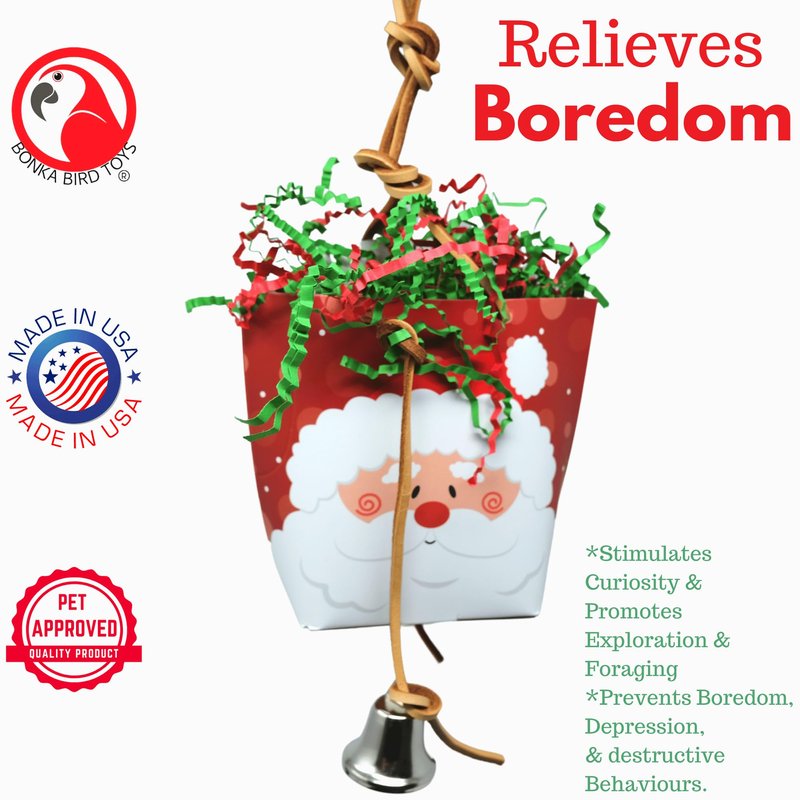 - Festive Design: Enjoy the holiday season with a jolly Santa Claus-themed 2563 Christmas Purse foraging toy that adds a touch of festive magic to your bird's cage.