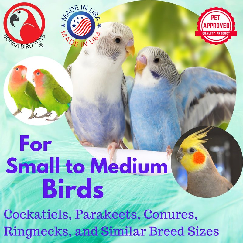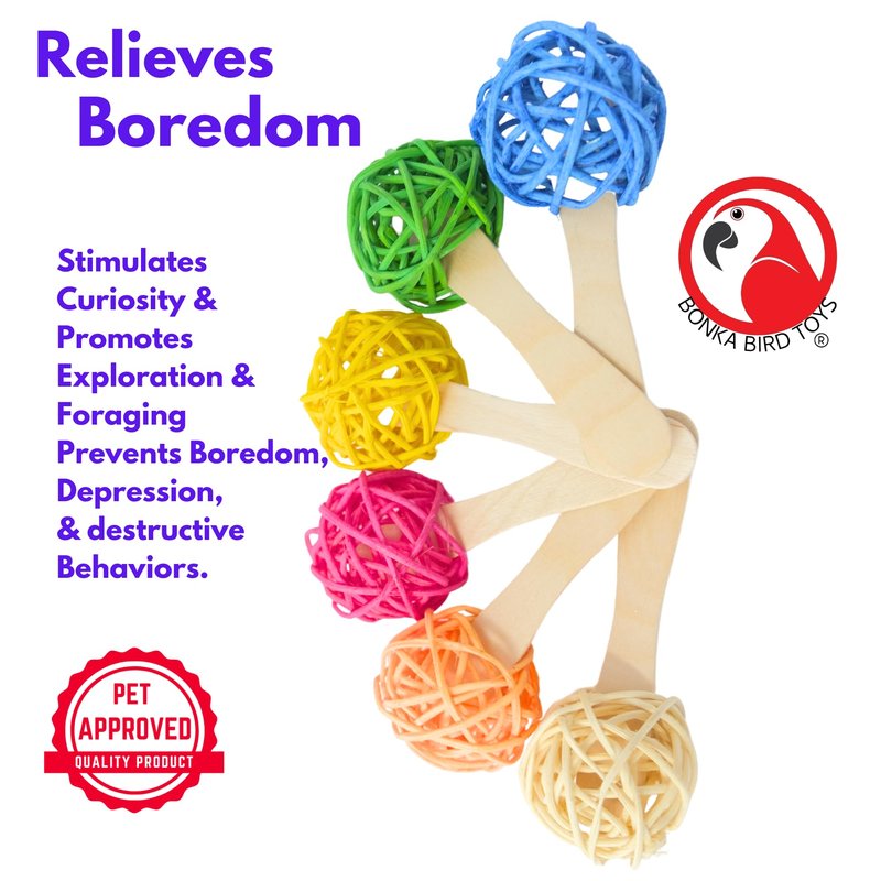 Introducing the Bonka Bird Toys 2642 Pk6 Vine Lollipop—a delightful and playful addition to your bird's toy collection. These unique lollipop foot toys, measuring 4 inches in length with a 2-inch diameter, are perfectly sized and lightweight at 2 ounces each, making them easy for birds to manipulate and enjoy. Crafted from natural wicker balls attached to sturdy wooden popsicle sticks, these toys are designed for safe and durable playtime. The vibrant colors of the Vine Lollipops captivate and stimulate your bird's visual senses, while the natural textures encourage instinctual pecking and provide excellent opportunities for beak conditioning. These toys promote both foot and beak exercise, enhancing your bird's dexterity as they learn to hold, toss, and peck at the lollipops. Additionally, the Vine Lollipops offer mental stimulation, keeping your bird engaged and helping to prevent boredom and associated behavioral issues. Perfect for birds of all sizes, especially those that enjoy foot toys, the 2642 Pk6 Vine Lollipop is ideal for bird owners looking for toys that provide both physical and mental challenges. Packaged in a set of six, these lollipop toys are an excellent way to keep your bird entertained and active throughout the day, whether used in their cage or during supervised playtime.