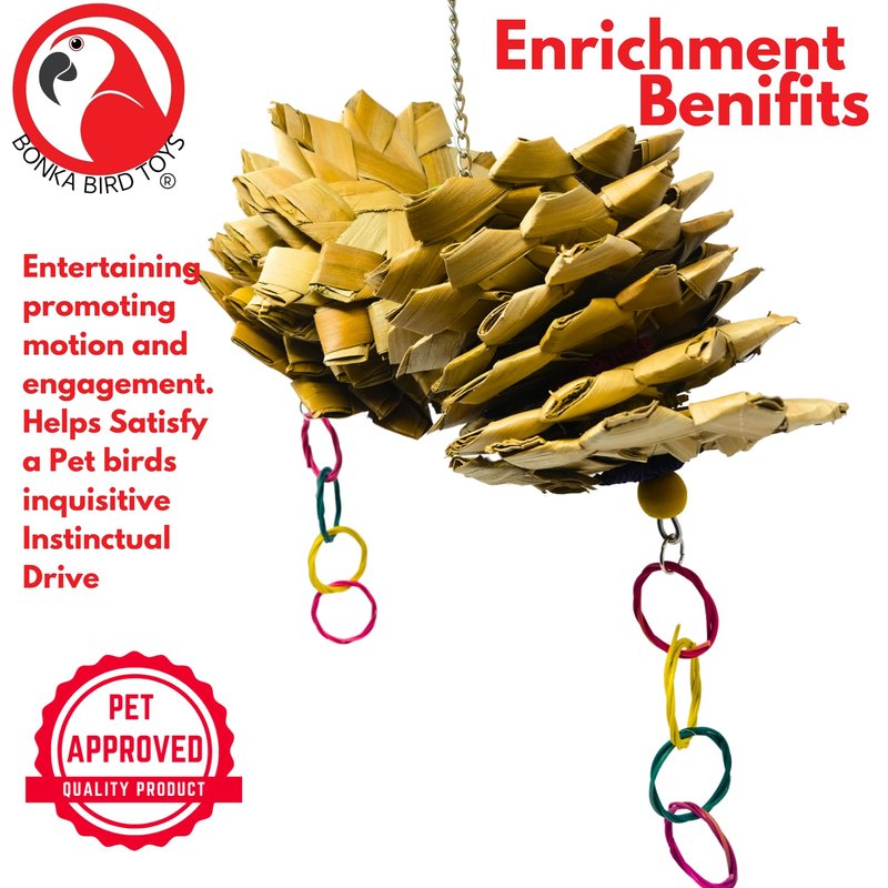 Discover the 2650 Palm Star Delight from Bonka Bird Toys, a captivating and enriching toy designed to brighten your bird's day with natural textures and vibrant colors. This engaging toy is composed of 12 intricately woven palm leaf stars, each meticulously crafted to provide not just a fun chewing experience but also a tactile challenge that encourages your bird to explore and interact. The overall dimensions of the Palm Star Delight are approximately 11 inches in height and 9 inches in width, with each star measuring about 6 inches across. This generous sizing makes it suitable for a range of bird sizes, from small conures to medium-sized African Greys, offering ample space for play. Enhancing its appeal, each end of the toy is adorned with colorful wooden beads and vine rings, introducing additional materials and textures for your bird to enjoy. These elements are not only visually stimulating but also beneficial for beak health, as they provide an appropriate outlet for pecking and pulling. Crafted from bird-safe, all-natural palm leaves, the Palm Star Delight is as safe as it is fun, free from any toxic materials. Its design not only entertains but also stimulates your bird mentally, making each interaction both enjoyable and beneficial to their well-being. This toy is perfect for bird owners who are looking to enrich their pet's environment with a toy that supports physical activity and mental agility. It's easy to install, equipped with a sturdy chain and hook for secure hanging within the cage, ensuring it remains in place during even the most vigorous play. With the 2650 Palm Star Delight, transform your bird's cage into a dynamic playground that encourages discovery and engagement, helping to keep your feathered friend active, entertained, and healthy.