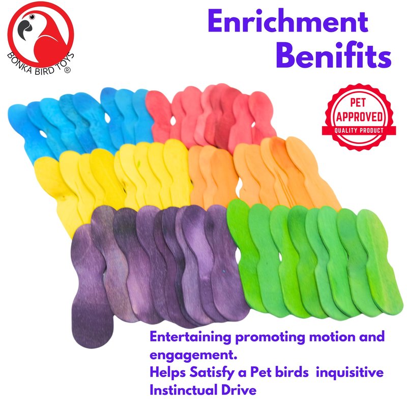 Introducing the Bonka Bird Toys 2665 PK50 Mini Scoop Spoon—a vibrant and versatile pack of 50 wooden tongue depressors, perfect for adding a splash of color and creativity to your bird’s toy collection. Each spoon measures approximately 3 inches long and 1 inch wide, and the entire pack weighs around 2.5 ounces, making it an ideal choice for various play and DIY projects. Crafted from vegetable-dyed wood, these spoons are safe and durable, providing a rainbow of enticing colors to stimulate your bird's visual senses and encourage interaction. The 2665 Mini Scoop Spoon set is perfect for small to medium birds, offering endless possibilities for foot toys and creative building blocks for DIY toy projects. The colorful design of these spoons not only captivates your bird’s attention but also promotes mental stimulation by encouraging creative play and problem-solving. They help enhance physical activity by promoting dexterity and coordination while providing a satisfying chew experience. Bird owners who enjoy crafting personalized toys will find these spoons great for tailoring to their bird’s preferences. Perfect for birds of all sizes, especially those who enjoy foot toys or require gentle beak activities, the 2665 PK50 Mini Scoop Spoon set is a fantastic way to engage your pet in unique and stimulating play. Whether used individually or as part of a larger project, these spoons are sure to provide hours of enjoyment and discovery.
