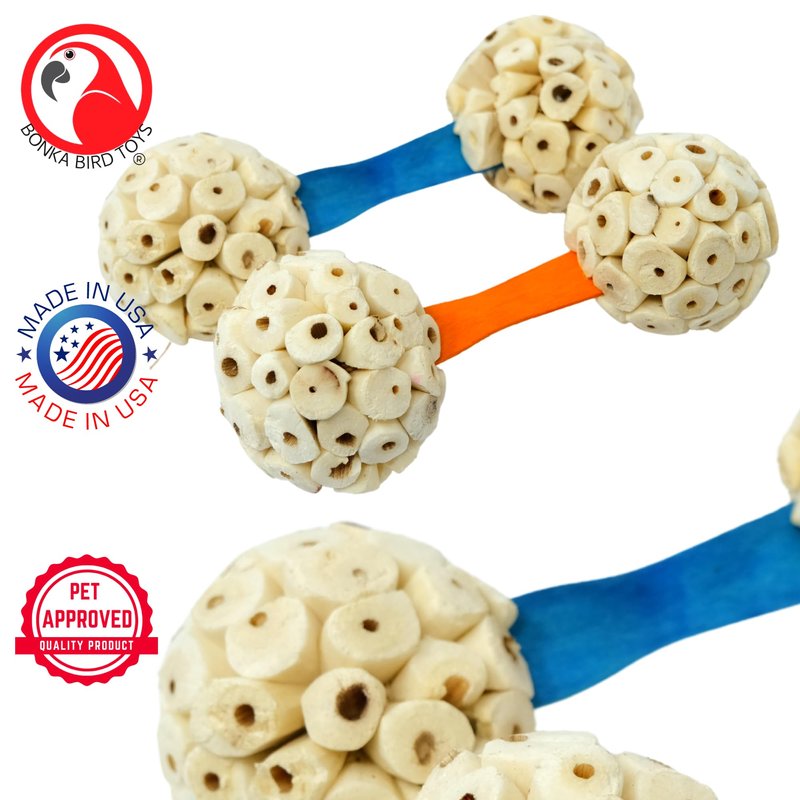 Elevate your small bird's playtime with the 2965 PK2 Sola Dumbell from Bonka Bird Toys. Part of our acclaimed Sola series, this unique toy is designed to engage your feathered friend with natural textures and a playful dumbbell shape. The toy is perfectly sized for small to medium-sized birds, ensuring a manageable and entertaining play experience. It features two 1.50-inch sola balls at each end, offering a soft and chewable texture that birds love. This variety in texture keeps your bird engaged and happy. Made with bird-safe popsicle sticks, this toy is fun and secure, holding together reliably for your bird's safety. We pride ourselves on using all-natural materials, making this toy 100% bird-safe, giving you peace of mind. The lightweight design of the 2965 PK2 Sola Dumbell, weighing less than an ounce, is easy for birds to handle, encouraging active play and exploration. This toy provides mental and physical stimulation and enhances your bird's life. Offer your minor to medium-sized birds the gift of fun and exercise with a safe and engaging play experience.