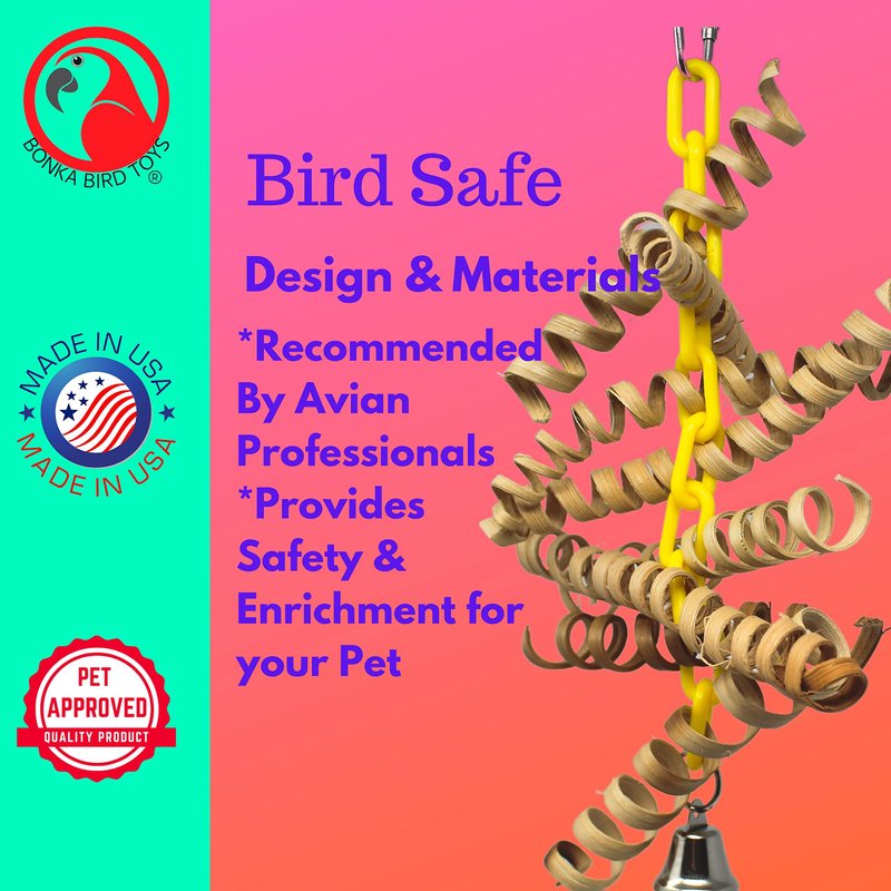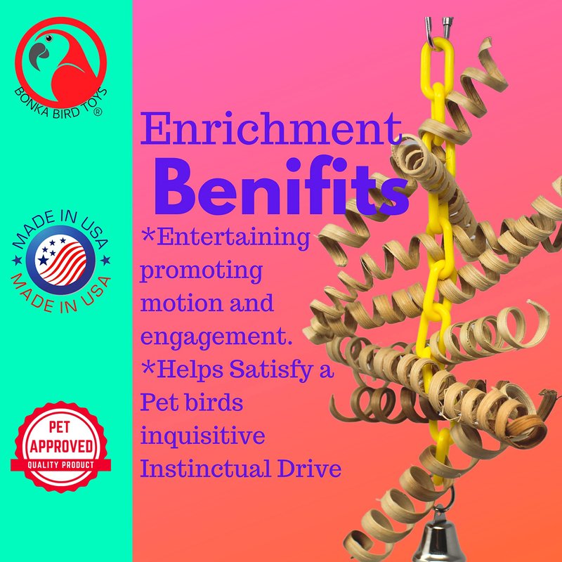 The 3449 Bamboo Spring from Bonka Bird Toys is a bouncy good time for your friendly chickies! The flexible shape of the 3449 makes it easy to install it in any cage. The quick link attachment at the top of the toy makes for fast and easy installation. The link loops through a colorful plastic chain that continues down through the center of the entire toy. This chain ends in a metal loop with a metal bell hanging. There are numerous bamboo springs strung through the plastic chain. These springs are perfect opportunities for your pet to pull and chew as they spring back to shape and move the toy all over the place. The 3449 Bamboo Spring from Bonka Bird Toys is 100% bird safe and weighs and measures approximately: Length: (11) inches Width: (7) inch Depth: (2) inch Weight: Under (4) ounces Cute springy bird toy. Full of fun bamboo springs. Easy to pull and chew. A refillable chew puzzle of a toy. All-natural Bamboo coil springs. 100% bird-safe materials. Quick link for easy cage placement.