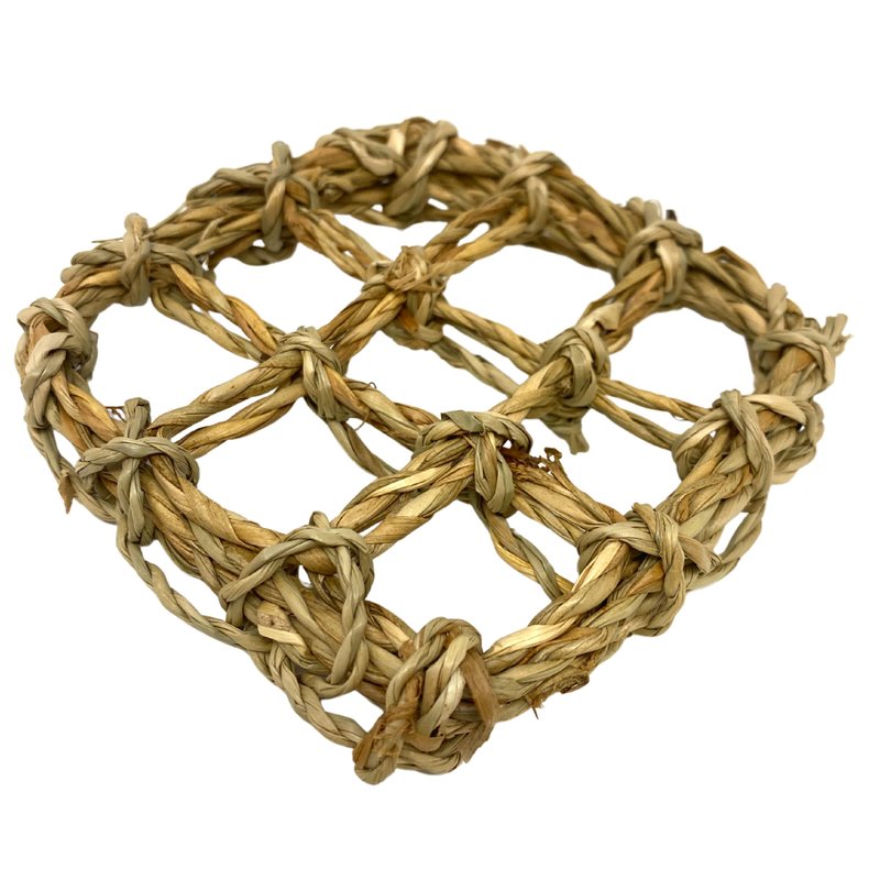 3733 Small Square Seagrass Mat 3x3 with tons of toy making potential, fold and stuff for foraging, hang for climbing, stuff it and roll it, decorate it with your imagination, it is just great as a starter base. The woven seagrass grid is a launching pad for your bird's playtime shenanigans, watch her climb the various seagrass rungs and play with the various items you have decorated it with. It measures approximately 3 inches long by 3 inches wide by 1/4-inch deep.
