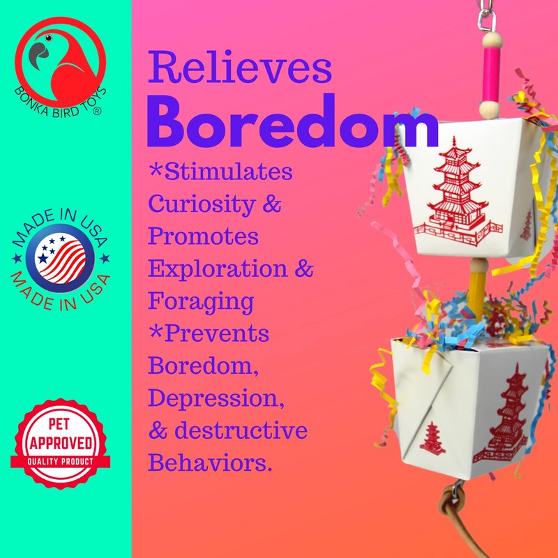The 3874 Duo Take Out from Bonka Bird Toys is a foraging delight for your small to medium-sized feathered friends, a great toy to hide treats within for those birds with active minds and busy beaks. Two Chinese oyster pail take-out boxes are crammed full of colored crinkly foraging paper, dressed with plastic cylinders, wooden beads, and a knotted strand of vegetable-tanned leather. There are multiple options for hiding treats and other goodies inside or around the toy; besides all the chew textures, a colorful and bright toy is sure to entice and satisfy his curiosity. This hanging fun-filled trinket will alleviate cage boredom and enrich his cage surroundings. The refillable and reusable toy is made in the USA and is 100% bird-safe, giving you peace of mind when it comes to playtime. The 3874 Duo Take Out from Bonka Bird Toys measures approximately ten (10) inches high by three (3) inches wide, weighs around 2 ounces, and comes complete with a sturdy hanging chain and a quick link for easy cage placement in or out of the cage.