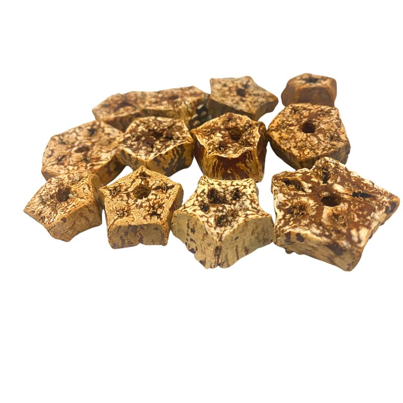 The 3893 Pk12 Mahogany Sliced Pods from Bonka Bird Toys are naturally chewable foot toys your pet will love! The 3893 comes with (12) mahogany slices ready to be played with. The mahogany slices are made from all-natural mahogany wood, a great bird material. They'll enjoy chewing on the pieces and feeling them with their feet. The mahogany color has a tremendous natural, muted look that blends into any cage environment. Each slice has its natural shape and different kinds of rough textures. A small hole drilled in the center of each piece creates lots of creative options. You can hang them from other toys, string them up around the cage and add them to any area your imagination comes up with! The pack itself weighs about (3) ounces. The 3893 is 100% bird safe.