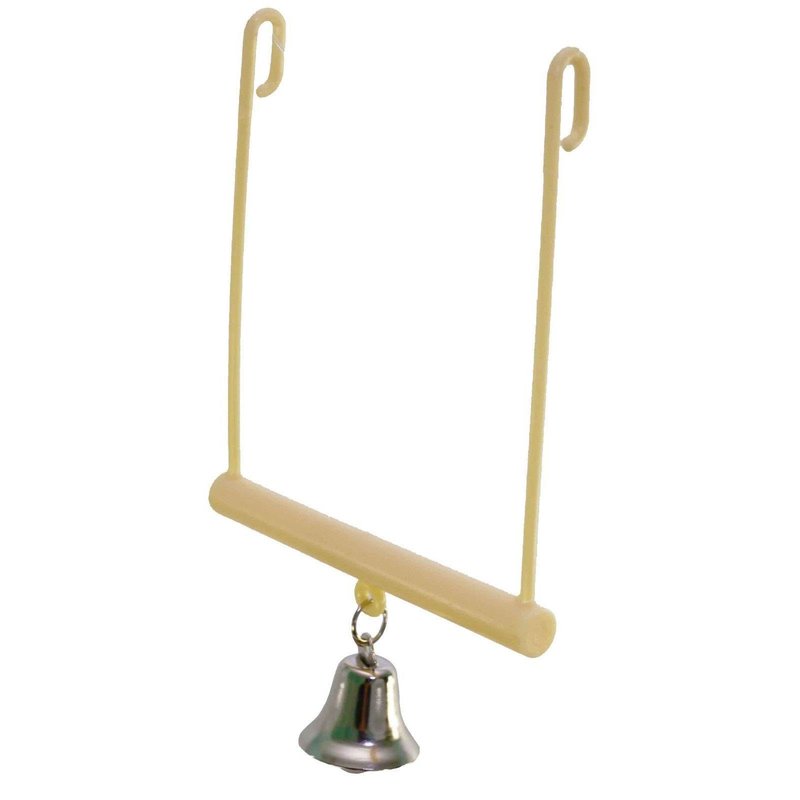 6514 This tiny plastic swing can be used for all types of small birds from finches to lovebirds. Swings are a normal perching activity for birds giving them a place to rest whilst also enjoying the rocking motion. Birds can see color and will be attracted to the bell on the swing.