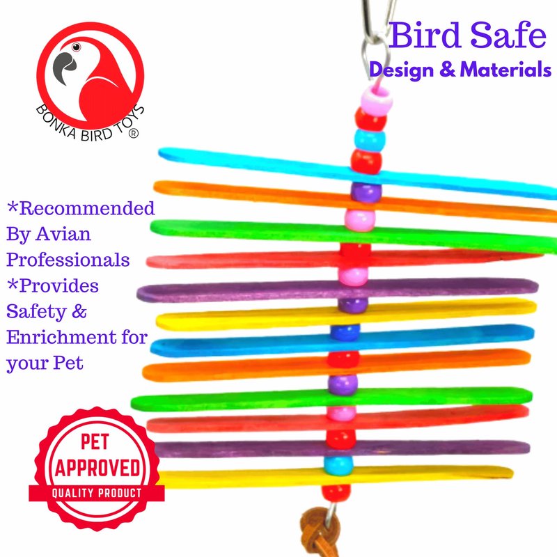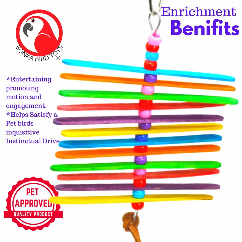 Product Model Number and Name: 868 Mini Stick Product Features: Vibrant Rainbow Colors: The 868 Mini Stick is a colorful and easy-to-play small bird toy that will add a pop of brightness to your pet's cage, featuring a rainbow color scheme that's visually appealing in small cages. Quick Link Connector: At the top of the toy, you'll find a quick link connector, allowing for fast and convenient hanging within the aviary. Interactive Design: A metal wire runs through the toy, supporting its shape, and is adorned with (4) colorful plastic beads that continue through the entire toy, sitting between each of the chewable wooden sticks. Natural Leather Loop: The metal wire ends at the bottom of the toy in a small loop, wrapped with an all-natural leather strip that's perfect for grabbing and chewing, enhancing the tactile experience for your pet. Chewable Sticks: The main part of the toy consists of numerous colorful bird-safe chewable sticks, each with small holes in their centers, allowing them to move when your pet interacts with the toy. Additional Product Benefits: Ease of Play: The 868 Mini Stick provides an enjoyable and interactive experience for pet birds, offering easy grabbing and stimulating movement that's sure to entertain your feathered companion. Perfect for All Ages: This small bird toy is suitable for birds of all ages, making it a versatile and long-lasting addition to your bird's habitat. 100% Bird Safe: Rest assured that this bird toy is designed with your pet's safety in mind, ensuring it is entirely bird safe. Key Applications and Industries: The 868 Mini Stick is a versatile and colorful bird toy suitable for various bird species and is commonly used by pet bird owners, aviculturists, and in professional aviaries. It is designed to provide entertainment, mental stimulation, and physical engagement for birds in a wide range of habitats. Specifications: Length: Approximately 5.25 inches Diameter: 4.5 inches wide Weight: 0.38 inch depth