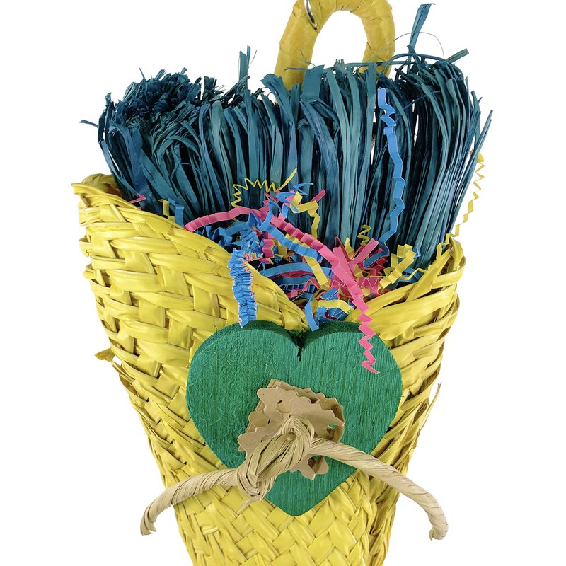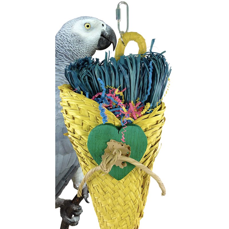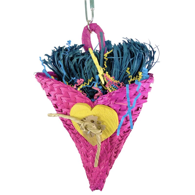 950 Bouquet Taco bird toy is a super shredder and foraging toy for that special medium sized pet in your family, a colored natural woven basket is stuffed with colored crinkly paper and shredded natural colored raffia, decorated with chewable colored wooden hearts and tied leather strands, this is sure to alleviate that cage boredom. Measures approximately 6 inches wide by 14 inches high, suspended with a sturdy link chain and a quick link for easy cage placement. May come in a different color than shown if not stated.
