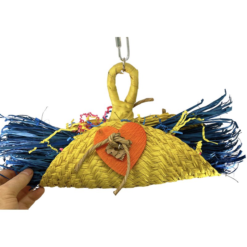 Introducing the 950 Taco Bird Toy, a versatile and engaging solution for medium-sized pet birds. This delightful bird toy offers a range of features and benefits to keep your feathered friend entertained and mentally stimulated. Product Features: Super Shredder and Foraging Toy: The 950 Taco Bird Toy is designed for the enjoyment of medium-sized pet birds. It includes a colored natural woven basket filled with colored crinkly paper and shredded natural colored raffia, along with chewable colored wooden hearts and tied leather strands, providing a multifaceted play experience. Cage Boredom Alleviation: This toy is designed to alleviate cage boredom and ensure your pet bird's mental and physical well-being. Generous Size: Measuring approximately 12 inches in width and 9 inches in height, the 950 Taco Bird Toy offers ample space for your bird to explore and interact. Sturdy Link Chain: The toy is suspended with a sturdy link chain, ensuring durability and safety during play. Quick Link for Easy Cage Placement: Equipped with a quick link, this bird toy can be effortlessly placed within your bird's cage for quick and convenient installation. Additional Product Benefits: Refillable Design: The 950 Taco Bird Toy is refillable, allowing for continued entertainment and extended use, making it an excellent long-term investment for pet bird owners. Bird-Safe Materials: We prioritize the safety of your feathered friend. All materials used in the 950 Taco Bird Toy are bird-safe and non-toxic. Key Applications: The 950 Taco Bird Toy is suitable for a wide range of medium-sized pet birds, offering a stimulating and interactive experience to combat cage boredom. It is commonly used by pet bird owners in household settings and by aviculturists and professional aviaries to ensure the mental and physical well-being of the birds in their care. Bring home the 950 Taco Bird Toy and give your pet bird hours of engaging play and exploration.