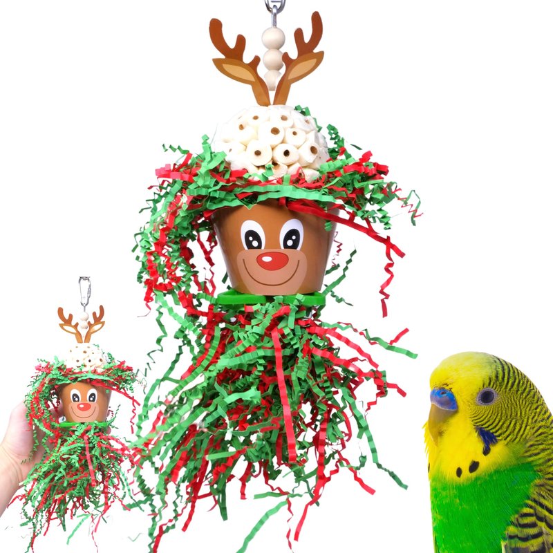 The 2437 Sola Reindeer from Bonka Bird Toys lets your small to medium-sized cherished feathered friends embrace the Holiday Season with this excellent stocking stuffer. A colorful Christmas-themed comical cup depicting a Reindeer is stuffed with a natural Sola Atta ball and adorned with red and green festive foraging crinkly paper. The Sola Reindeer offers multiple healthy play activities, helps engage their curious minds, and will alleviate the cage boredom through the Christmas period. This true holiday gift will keep on giving. The Sola Reindeer is 100% bird safe, comes in bright bird-pleasing Christmas colors, weighs and measures approximately twelve (12) inches high by three and one half (3.50) inches wide, and weighs two (2) ounces. It has a quick link for easy placement in or out of the cage—an ideal gift for Cockatiels, Parakeets, Conures, and other similar birds.
