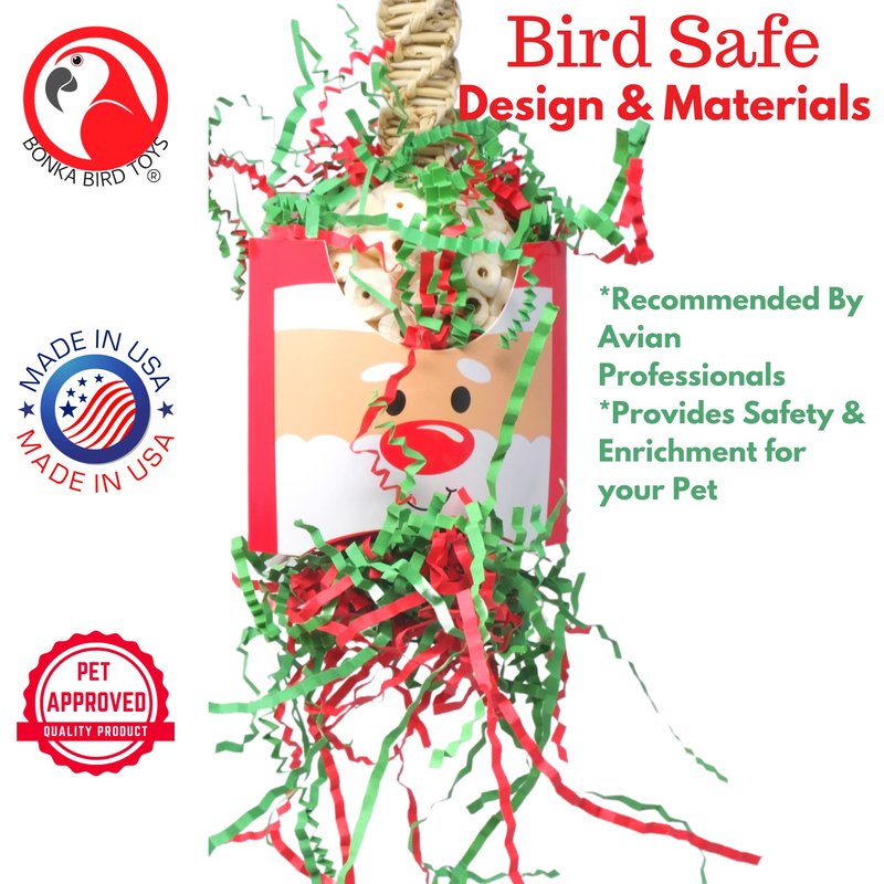 - The Santa Claus, Christmas Reindeer, and Snowman from Bonka Bird Toys are 100% bird safe and come with a quick link for easy placement in or out of the cage