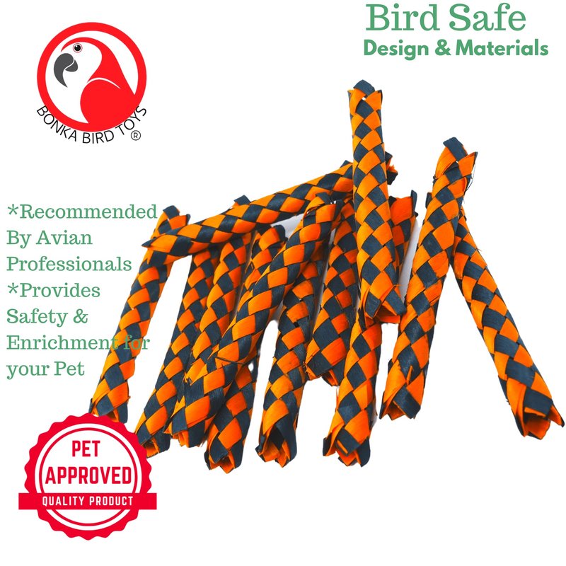 The Bonka Bird Toys Halloween finger traps in orange or green are a versatile and entertaining addition to bird toy-making projects or as foot-talon toys. These finger traps are orange and green, perfect for Halloween-themed bird toys or crafts. The finger traps are made from bamboo, ensuring they are 100% bird-safe and environmentally friendly. Each finger trap measures approximately 5 1/2 inches in length with a varied diameter of 1/2 to 3/4 inches.