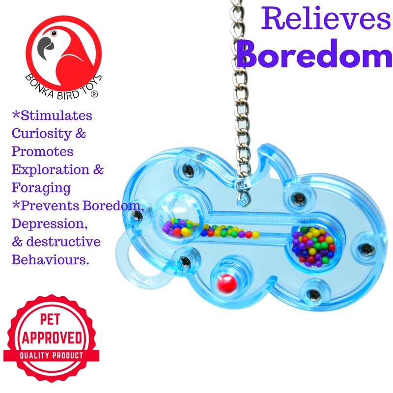 Bonka Bird Toys 0004 Small wave is yet another beak teasing delight of a toy, your small to medium sized bird will have hours of entertaining fun with lots of noise and motion, the virtually indestructible brightly colored plastic body is shaped like a wave and has a narrow channel encased in the center that is filled with solid plastic colorful beads that move from one side to the other as the toy is moved or tilted, each side has a "bubbled" area which gives it more depth and a visual enhancement for your bird, as an added bonus there is a solid loop so you can enhance small wave by adding more of their favorite play toys. It is suspended by a sturdy link Stainless Steel chain and a quick link for easy cage placement, small wave measures approximately 5 inches high by 6 inches wide.