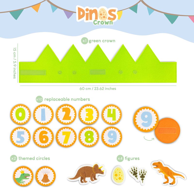 - π¦ 2 THEMED CIRCLES AND 4 FIGURES π¦ Contains 2 themed circles, a volcano and a dinosaur. Also includes 4 figures (2 dinosaurs, 1 dinosaur egg and 1 dinosaur footprints) for the boy or girl to place on any of the crownβs four felt points. Birthday boy crown and girl great for entertaining the little ones. 1yr old boy birthday gifts and girl