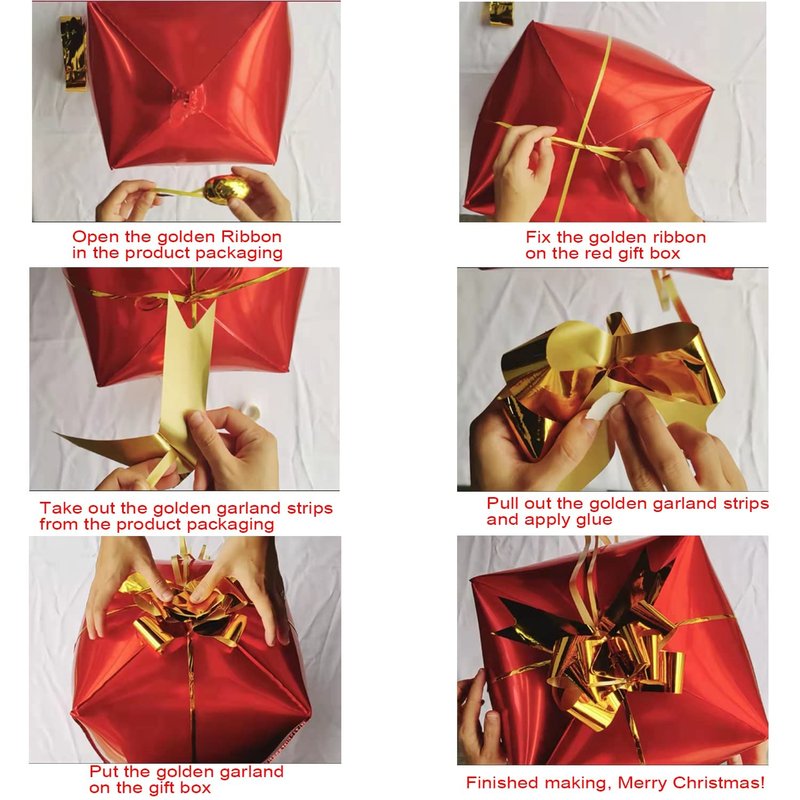 - 🍭【Packaging Includes】Latex Balloon Package (2pcs 18in +10pcs 12in +20pcs 10in +10pcs 5in red balloons,10pcs 12in +20pcs 10in +10pcs 5in dark green balloons,10pcs 12in +20pcs 10in +10pcs 5in lime green balloons,10pcs 10in gold balloons); Aluminum Foil Paper Balloon Package(2pcs 18in candy(A little blue at the edges) balloon + 1pcs 18in red star balloon+2pcs 24in gift box balloon+2pcs 33in and 2pcs 15in Candy Cane balloon); Whole Balloon Garland Accessories Kit (16ft balloon strip tape + 32ft ribbon+100 glue point*1 ).