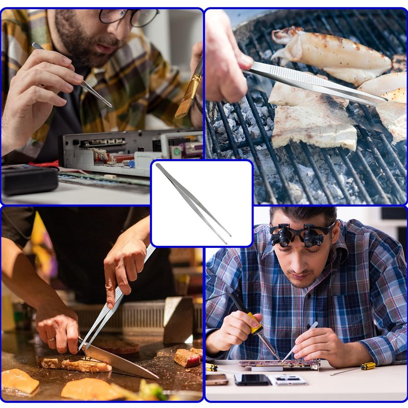 Bonsicoky 3Pcs Stainless Steel Tweezer Set (8" 10" 12"), Long Tweezers with Precision Serrated Straight Tips, Non-slip Multitool Tweezer for Cooking, Repairing, Medical, Garden