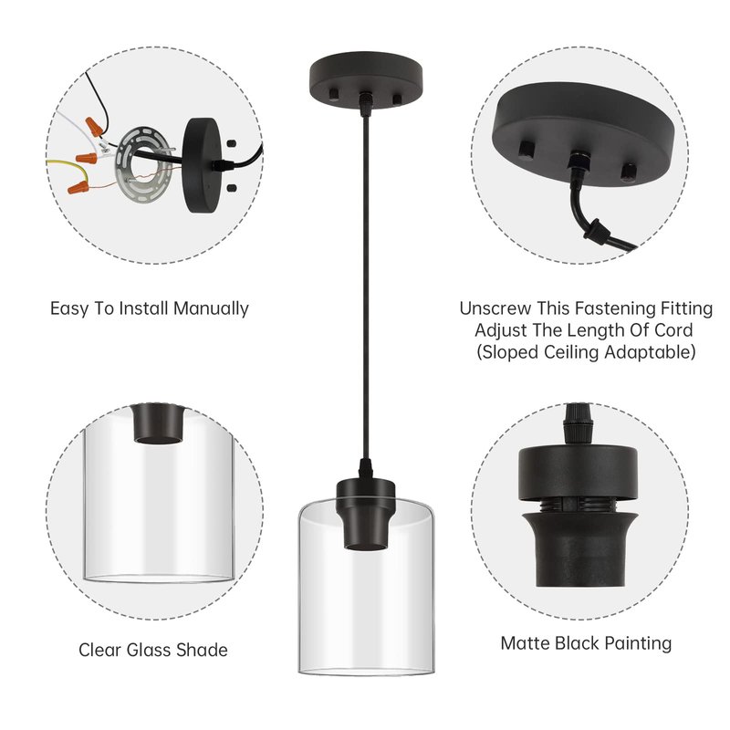 - High Quality: This black pendant light featured with high-quality materials and sturdy Clear glass lampshade, which is beautiful and durable for a long time. We are devoted to providing our customers great after-sales support with 1 years assurance.