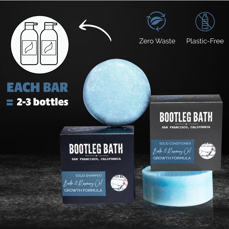 - ULTIMATE HAIR GROWTH FORMULA - The BOOTLEG BATH Growth Formula Shampoo and Conditioner Bar Set expertly pairs powerful Biotin & Rosemary Essential Oil. Known for increasing keratin production and stimulate hair follicles this growth, this antioxidant rich Shampoo and Conditioner Set delivers deep experience.