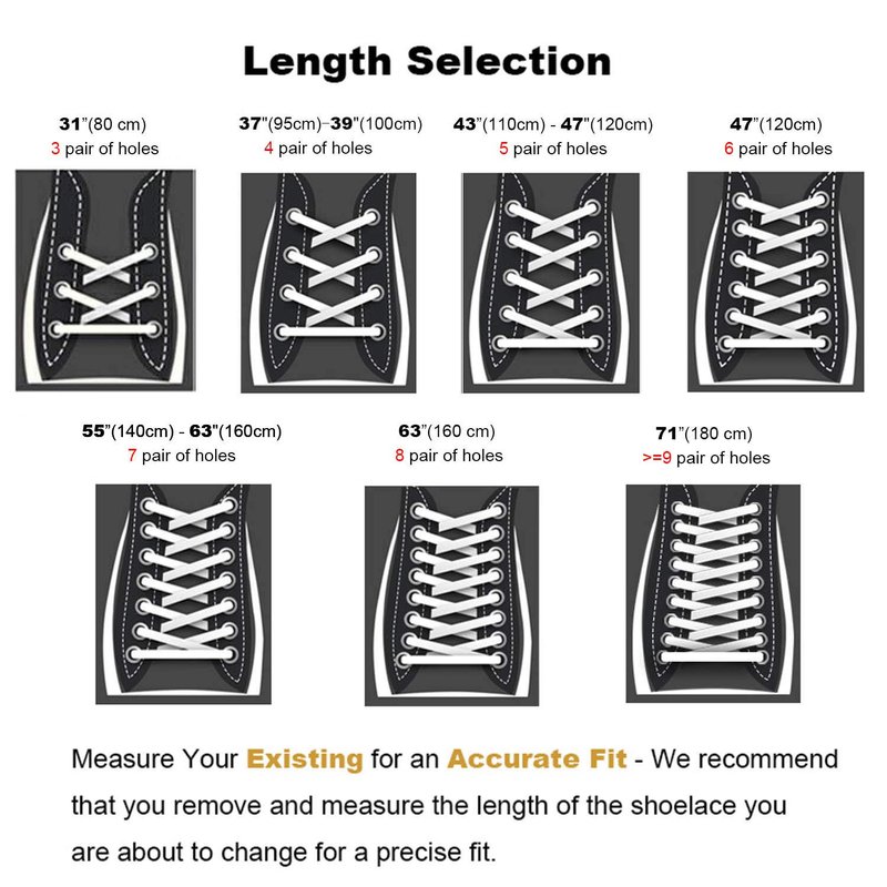 - 【Shoelaces Specifications】- Width: 0.8cm (about 5/16"); Provides five different lengths to chose: 31"(80cm), 39"(100cm), 47"(120cm), 55"(140cm), 63"(160cm);