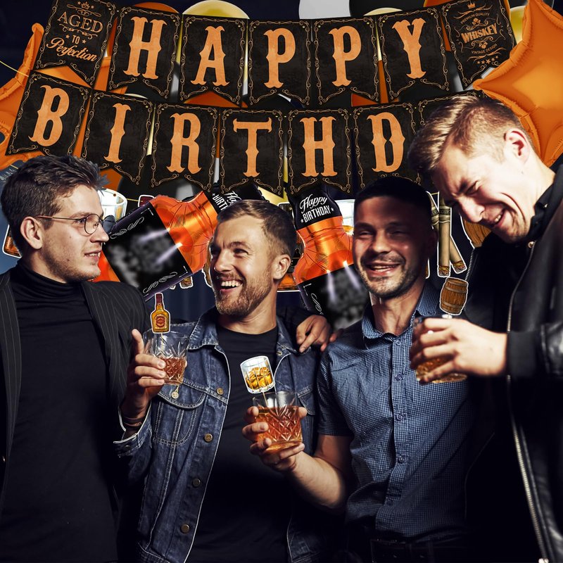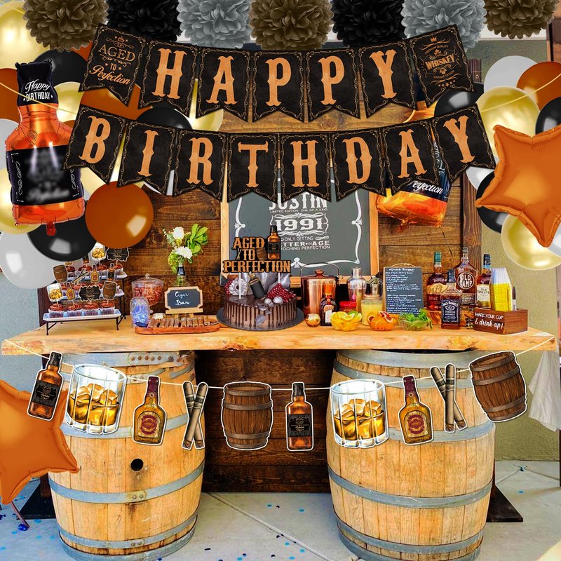 - Whiskey Birthday Party Decoration Pack: This whiskey party supplies include 1 x HAPPY BIRTHDAY Banner, 1 x Whiskey Theme Garland, 2 x Whiskey Bottle Foil Balloons, 2 x Star Foil balloons, 1pcs Age to Perfection Cake Topper, 12pcs Cupcake Toppers, 20 pcs Latex Balloons(4 colors), 6 paper pom poms(3 color).