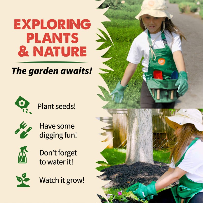 • 🌾 IDEAL GIFT: These kids garden tools are perfect for a kid's social development while learning about nature, and learning how to grow plants, fruits & vegetables. Teach them how to dig and plant with our child-friendly gardening kit for kids while using our childrens gardening gloves and kids apron to ensure an enjoyable yet safe planting experience